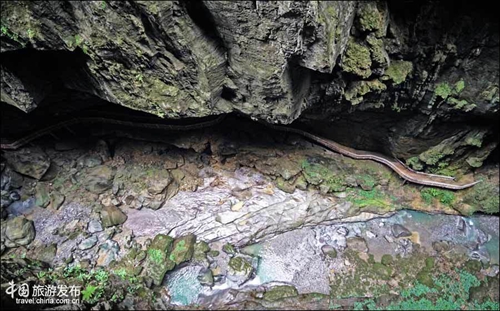再往前,便来到了景区的核心地带--青天峡,位于景区峡谷下段,全长1500米长,峡谷宽度2-5米,被称为天然地缝。峡谷两边悬崖峭壁高度在200-300米 ,抬头仅见天光一线。地缝中怪石林立,钟乳石千姿百态。沿着蜿蜒的栈道走在其间,幽谧古奇之感顿生,壁峭崖有的地方仅隔数尺,而悬在头顶的巨石更是令人震撼。 建在崖壁的的栈道也成为一道景致,如缠在崖壁的腰带或巨蟒,空旷幽谷中声音回荡,寻觅丝丝关于巴人的遗迹,只是他们早已穿越这时空之谷消失在了时间的洪流尽头。