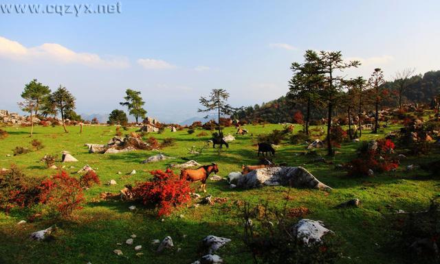 重庆石柱境内的千野草场被誉为重庆最美的草地,是喀斯特地貌,景区内旅游资源丰富,集山、林、草、石、畜于一体,万亩草场、万亩火棘、万亩石芽、万亩森林四大特色旅游资源镶嵌其中,是自然观光、休闲度假的理想胜地。
