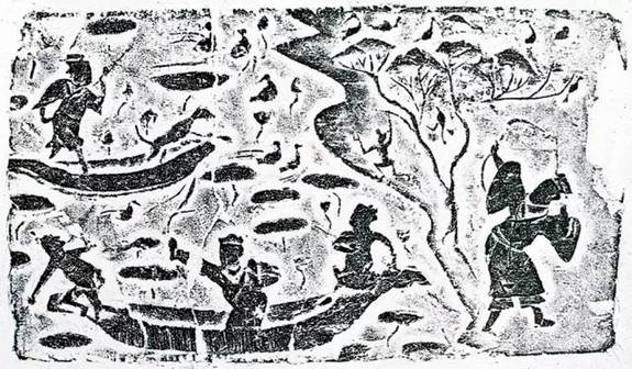 汉画像砖广泛分布于河南、四川、山东、安徽、江苏、浙江等地,其中河南和四川的汉画像砖较多,题材丰富,画面精彩。如河南画像砖《佩剑人物图》,刻画的是一位武士,他怒而扶剑,高度戒备,胡须与衣带飘飘,反衬出武士屹然不动的雄姿。四川汉画像砖则以反映现实生活为主,日常生活及劳动画面较多。如东汉画像砖《弋射收获》,描绘秋收季节的田野。上半部是渔猎,下半部是收获。上面的猎人正搭弓引箭,即将射向塘中飞鸟,蓄势待发的气氛颇为紧张。而下面收割稻谷的农人,三三两两,错落有致,洋溢着劳动的热情。