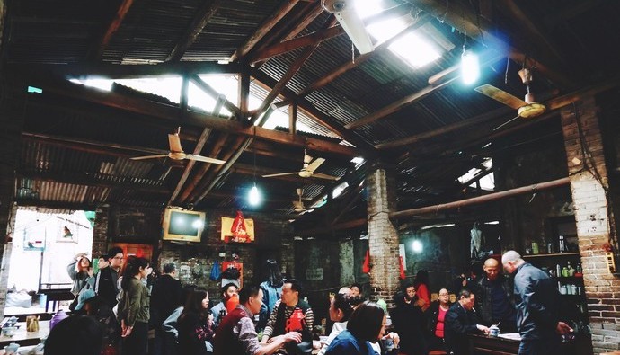 在黄角坪炫丽的涂鸦街中有一块非常惹人眼的老式招牌“交通茶馆”,就这楼道中的一道小门,一进去,一片绿林响马,快马写意,擦得黑亮的水泥地,破旧的木顶棚,泛青的砖墙,老式的吊扇,20多张的四方桌上都有茶客做着自己的事情,有的下棋、有的撮牌、有的就喝茶摆龙门阵。在这嘈杂热闹,充满重庆言子的四方天地里,找根长凳坐下,只需要花几块钱就可以泡杯茶在这坐一天,还能见识到了长嘴壶的茶艺。